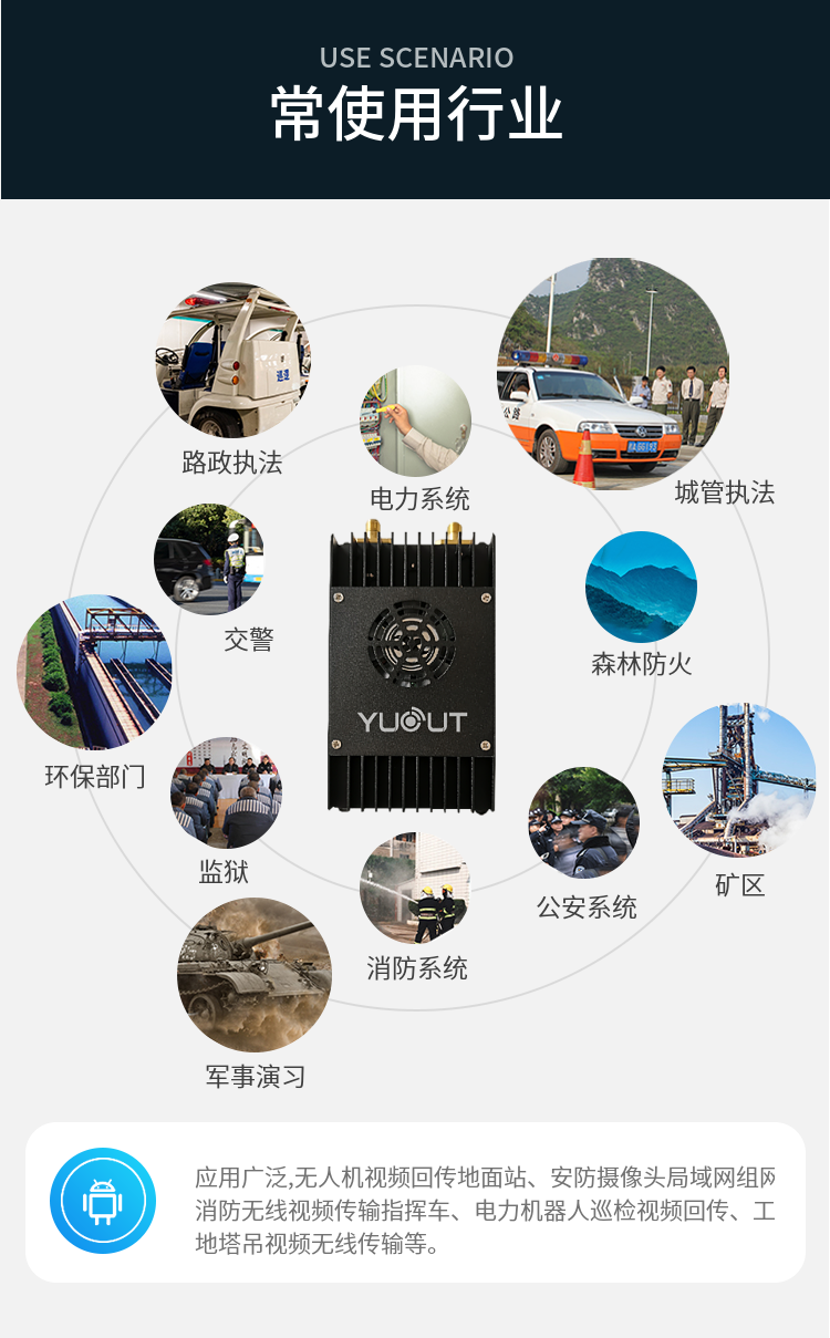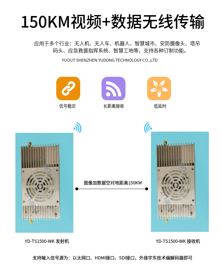 YD-TS1500-WK 是應用于無人機行業(yè)的圖數(shù)控一體化超遠距離無線傳輸設備(最遠可達 15至20 公里),具有體積小、功耗低、通信距離遠等特點,支持高清視頻、飛控數(shù)據(jù)、云臺控制數(shù)據(jù)、遙控器控制數(shù)據(jù)等同時傳輸。